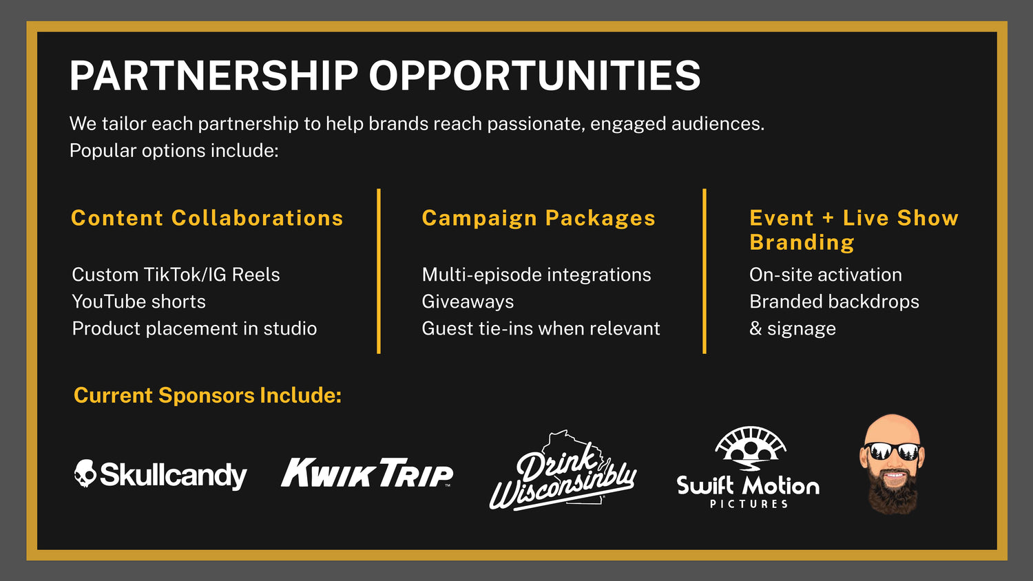 Partnerships start at $500 and scale to full-service brand integrations.