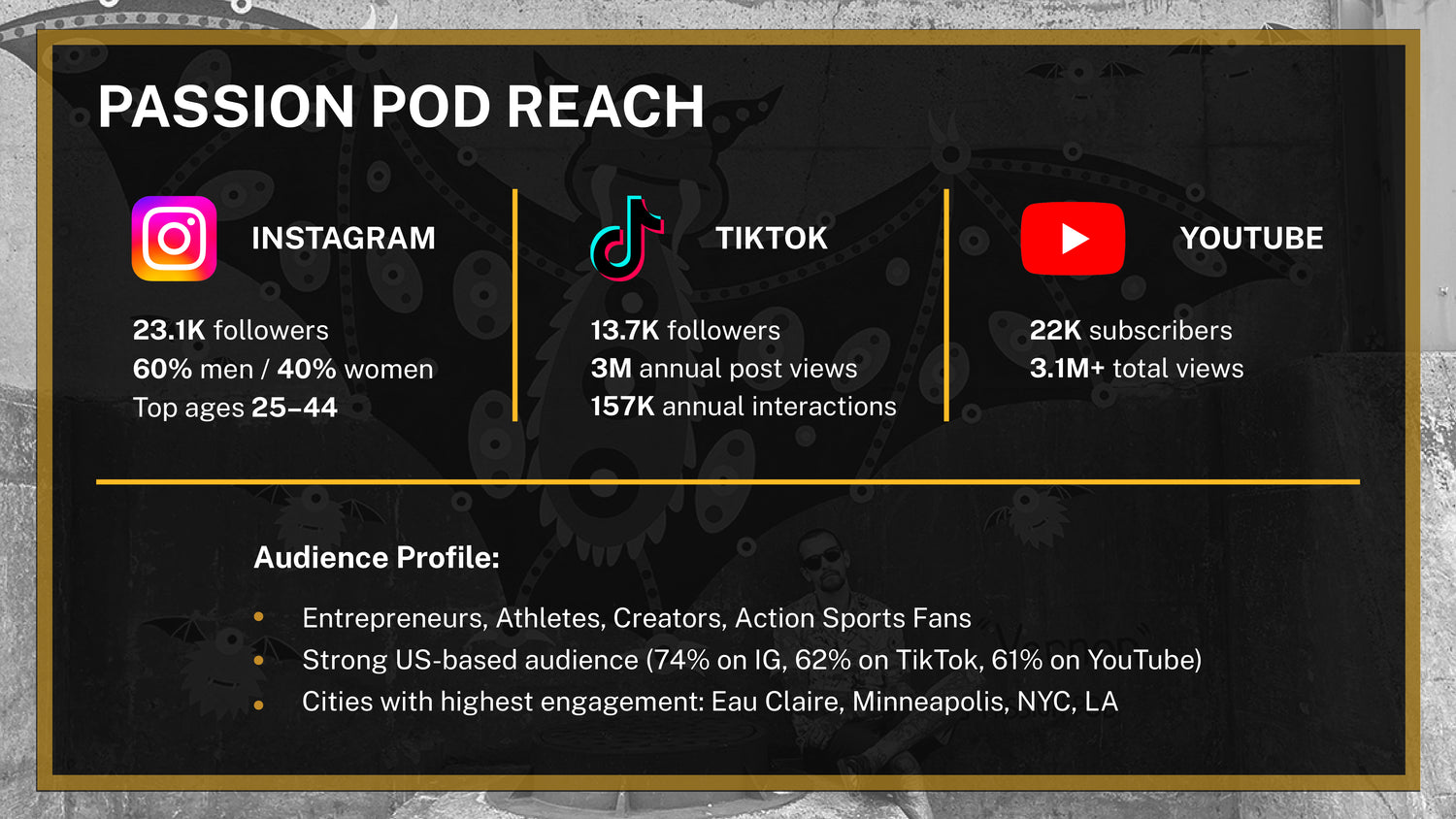 - Passion Pod guests collectively hold 150M+ followers across social platforms. Every episode has the potential to reach far beyond core audience.